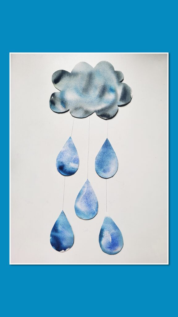 Once dry fold the cloud paper in half and start cutting out the cloud, make sure you are cutting both halves of the paper together. Then cut out all the raindrops carefully using scissors. Cut several lengths of thread or string—one for each raindrop. Attach one end of each string to the back of a raindrop using glue or tape. Then, attach the other end to the back of the cloud.