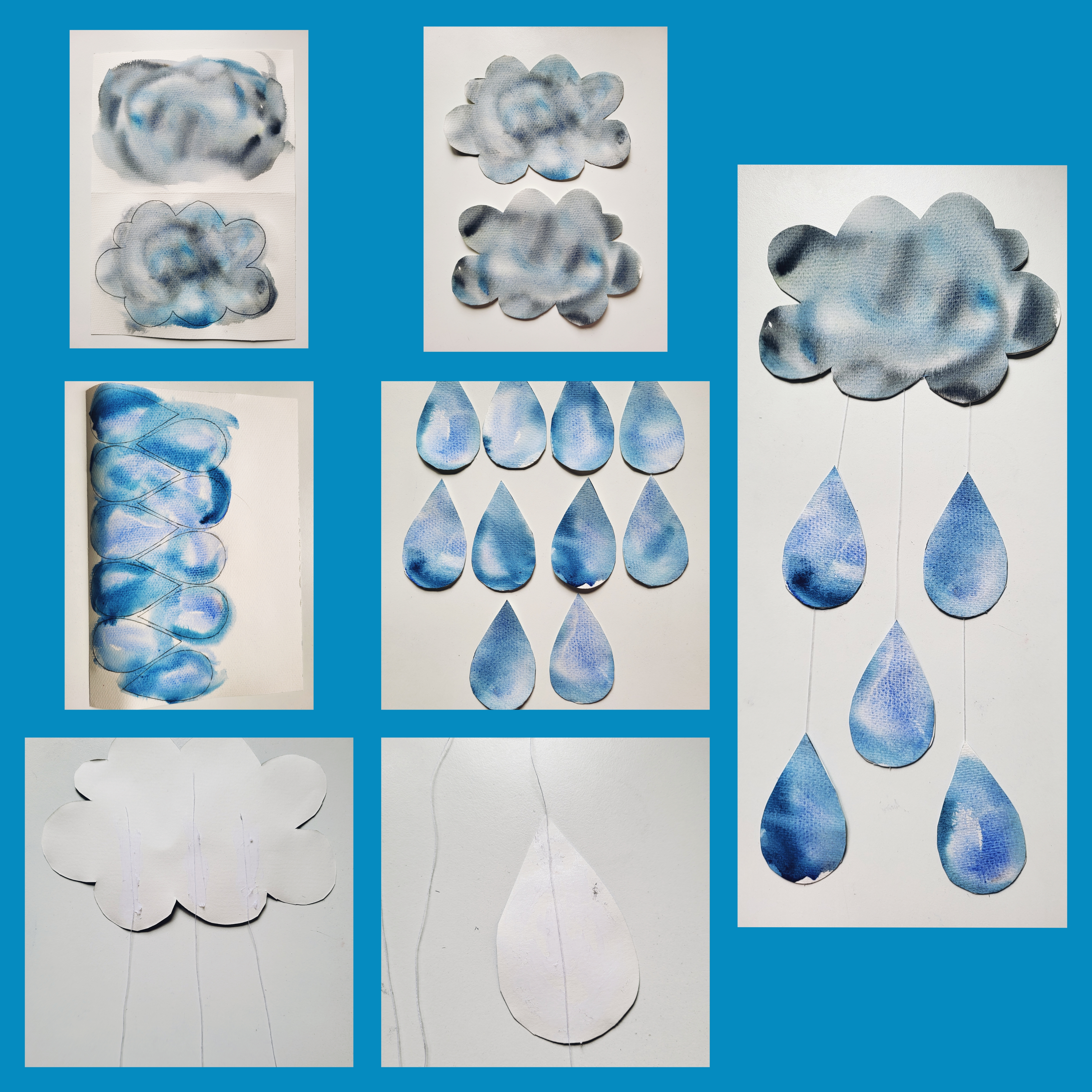 Cut 3 strings or threads of different sizes. Use a glue stick to apply glue to the back of one of the clouds. Then place the string on the glued cloud and glue the two clouds together. The strings or threads will be hanging down from the cloud. Take 1 raindrop and apply it on the back of it, place the raindrop under the string and make sure the string is going down the centre of the raindrop, then take another raindrop and stick it to the first raindrop making sure the painted side is on the top.